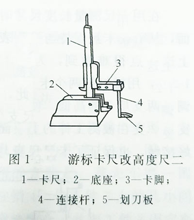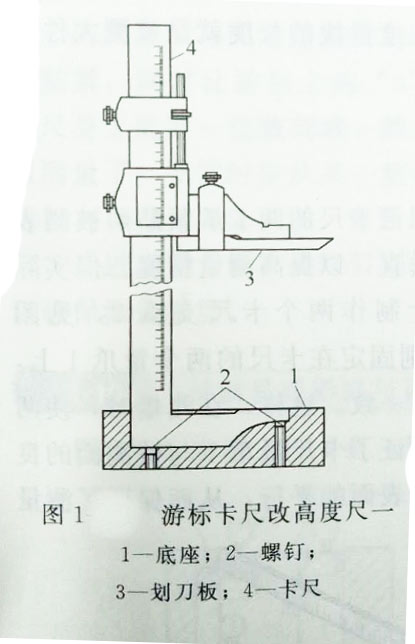 圖1是將一舊游標卡尺改制成為一高度尺,具體做法是:磨制一長方體底座1,在其一側(cè)面銑出與卡尺4固定卡腳相一致的槽,用壓板和螺釘從側(cè)面壓緊,但壓緊前先用底面上的兩個螺釘2把卡尺的卡腳口調(diào)平;在活動卡腳上固定一劃刀板3用以測量高度或劃線、